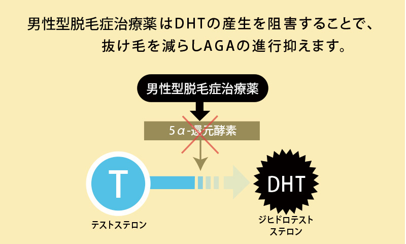 男性型脱毛症治療薬は、5α-還元酵素を阻害し、AGA(男性型脱毛症)の原因物質であるDHT(ジヒドロテストステロン)※の産生を抑制します。