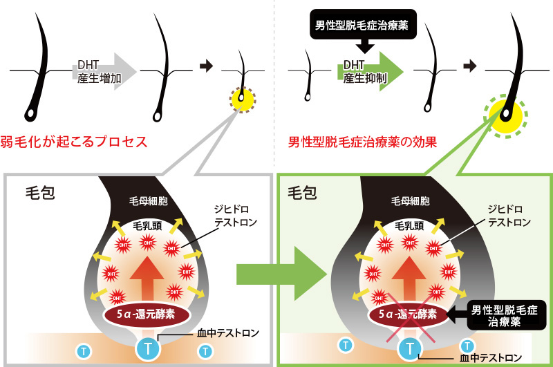 男性型脱毛症治療薬は、この5α-還元酵素を阻害し、DHTの産生を抑制することで抜け毛・薄毛を予防します。